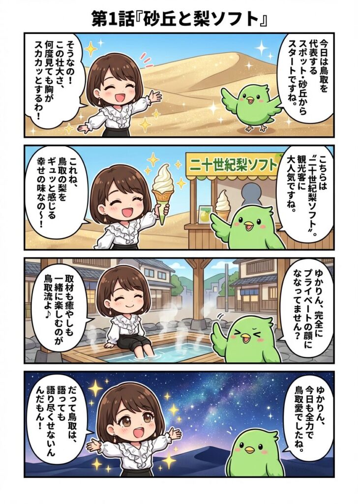 4コマ漫画では、日々の仕事の中に隠れたクスッと笑える「物語」を。 画面越しに伝わる鳥取の人の温かさに、きっとあなたも出会えるはずです。